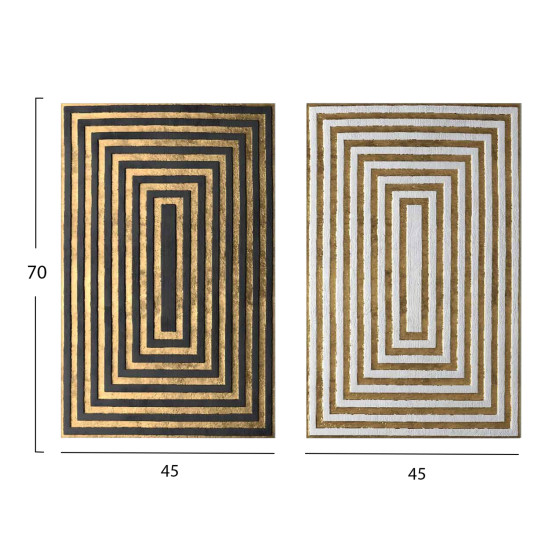 Οι πίνακες τοίχου μεταμορφώνουν τον τρόπο που αντιλαμβανόμαστε έναν χώρο. Διακοσμήστε, λοιπόν, τον χώρο σας με την καινούργια σειρά πινάκων τοίχου GOBI! Αυτοί οι πίνακες (2τμχ) σε κύρια χρώματα χρυσό, λευκό και μαύρο απεικονίζουν ομόκεντρα ορθογώνια, και έχουν υλοποιηθεί σε εκτυπωμένο καμβά σε πλαίσιο από ξύλο πεύκου, και μπορείτε να τους τοποθετήσετε είτε μαζί, είτε σε διαφορετικά σημεία τον καθένα!