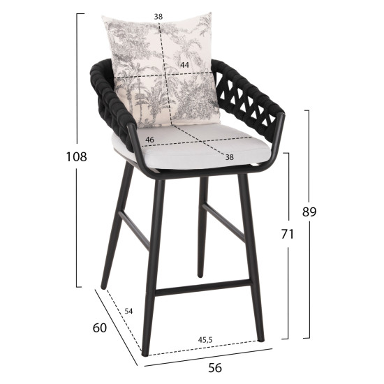 Το σκαμπό μπαρ αλουμινίου CAMDEN σε ΑΝΘΡΑΚΙ χρώμα δεν έχει ξεχωριστά μπράτσα αλλά η πλάτη είναι ημικυκλική αγκαλιάζοντας το σώμα. Πρόκειται για ένα ξεχωριστό σκαμπό με χαμηλή πλάτη από συνθετικό φαρδύ πολυεστερικό σχοινί (terylene). Το ιδιαίτερο χαρακτηριστικό αυτού του σκαμπό είναι ότι διαθέτει αναπαυτικά μαξιλάρια (με φερμουάρ) τόσο στο κάθισμα σε ΛΕΥΚΟ χρώμα, όσο και στην πλάτη σε ΕΚΡΟΥ χρώμα με PRINT σχέδιο.