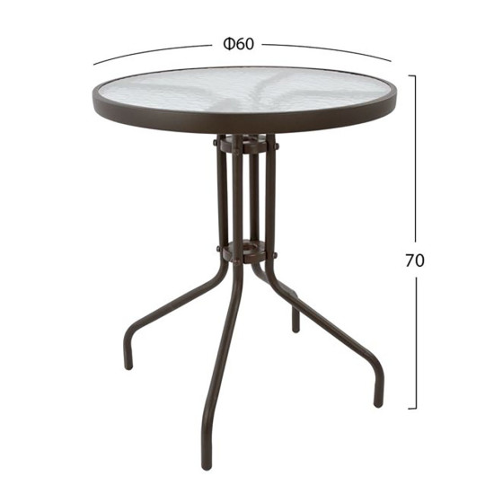 Το τραπέζι Adam είναι ένα στρογγυλό τραπέζι με επιφάνεια από ημιδιάφανο γυαλί ασφαλείας και μεταλλικά πόδια σε Καφέ χρώμα. Η γυάλινη επιφάνεια στηρίζεται σε έναν κυκλικό μεταλλικό «δακτύλιο» ο οποίος με την σειρά του στηρίζεται στην διάταξη των ποδιών. Ένα όμορφο και στιβαρό τραπέζι που θα ομορφύνει τον εξωτερικό σας χώρο.
