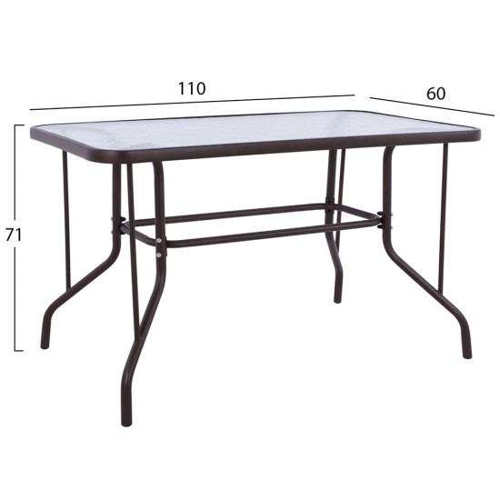 Το τραπέζι εξωτερικού χώρου έχει καφέ μεταλλικό σκελετό και γυάλινη θολή επιφάνεια! Πρόκειται για πολύ δημοφιλές τραπέζι που δεν λείπει σχεδόν από κανέναν μπαλκόνι ή κήπο.