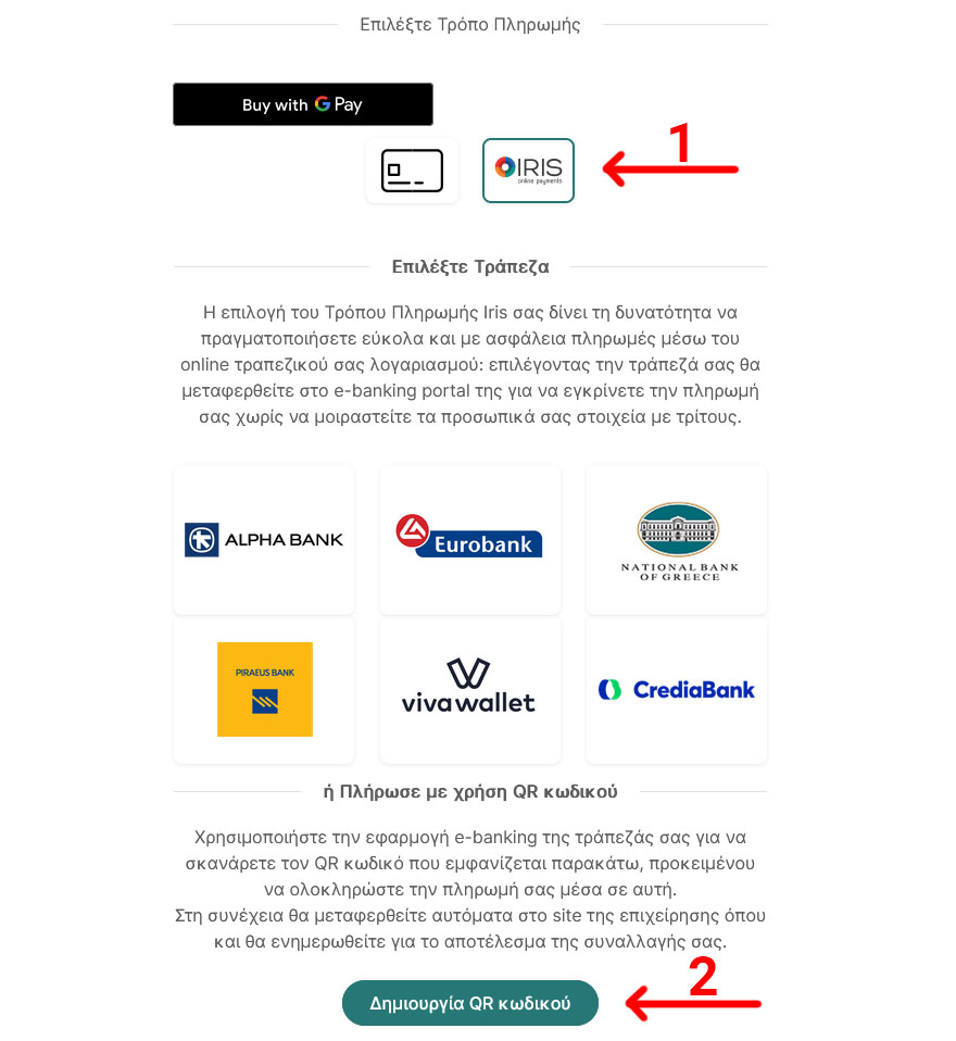 Στο περιβάλλον πληρωμής επιλέγεις 1.IRIS & 2.Δημιουργία QR κωδικού